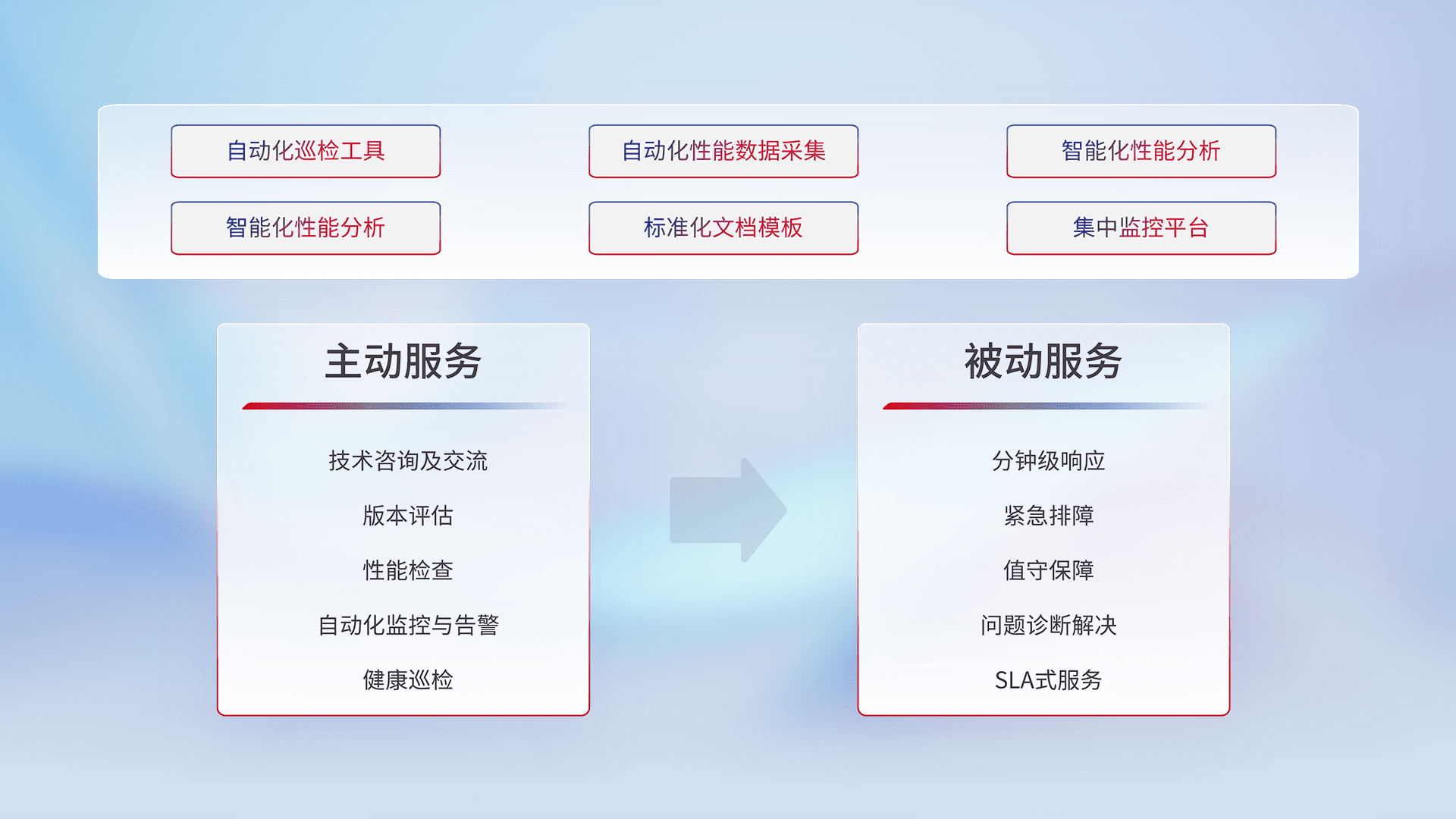 智能化工具和标准化文档,,,保障服务质量,,提供主动服务(包含技术咨询、、、、版本评估、、、性能检查、、自动化监控与告警、、、、健康巡检)和被动服务包含(分钟级响应、、紧急排障、、、、值守保障、、、问题诊断解决、、、SLA服务)。。。。